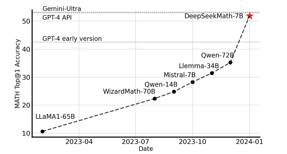 우선 DeepSeekMath는 수학 벤치마크에서 당시 Sota를 달성했다. 두가지 접근법이 있었는데 아주아주 많은 고품질의 데이터셋을 모은것, 그리고 GRPO 이다.