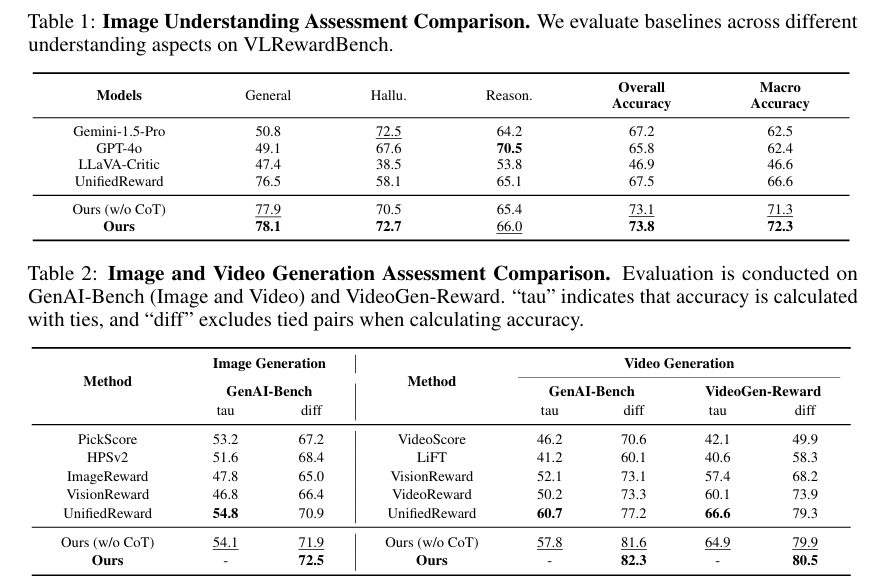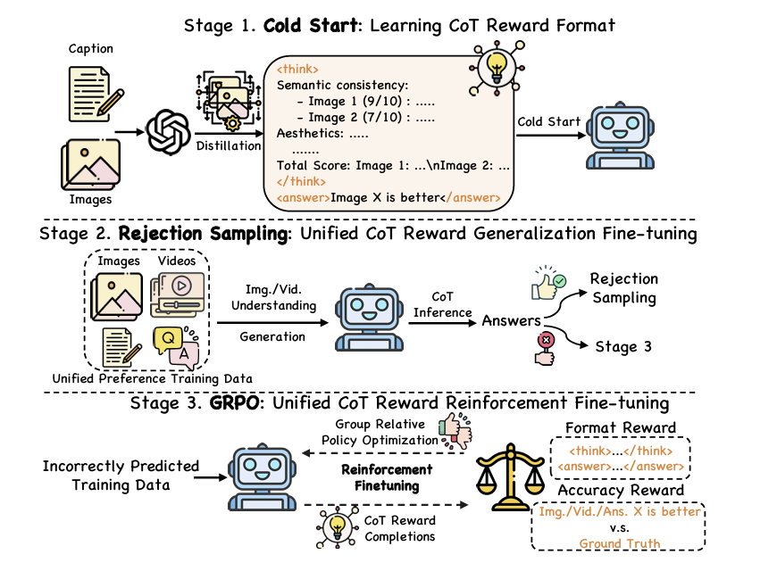 이 논문에서는 멀티모달 Reward Model에 긴 CoT 추론을 더해서, 복잡한 비전 task에서 신뢰도 높은 보상 신호를 제공하도록 만든다. 이를 위해,exploration-driven reinforcement fine-tuning이 제안되었다.