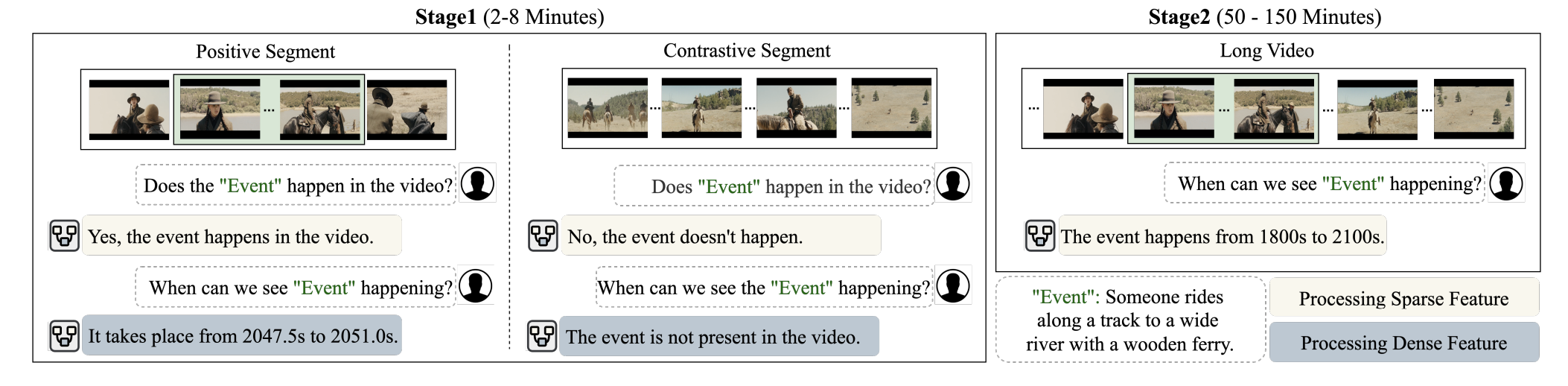 먼저 짧은 클립에서 ‘언제’와 ‘없음’을 확실히 가르친다, 이후 같은 짧은 클립을 다시 보되, 이번엔 어댑터만 학습해 ‘요약 토큰’ 만드는 법을 배운다. 이제 1 시간짜리 영상도, 3 분 간격 Sparse 토큰 20~30개만 보고 대강 위치를 찍을 수 있다. 필요하면 Stage 2가 찾아낸 구간을 다시 Dense 피처(=Stage 1-A 방식)로 확대해 프레임 단위 경계까지 정밀화한다.