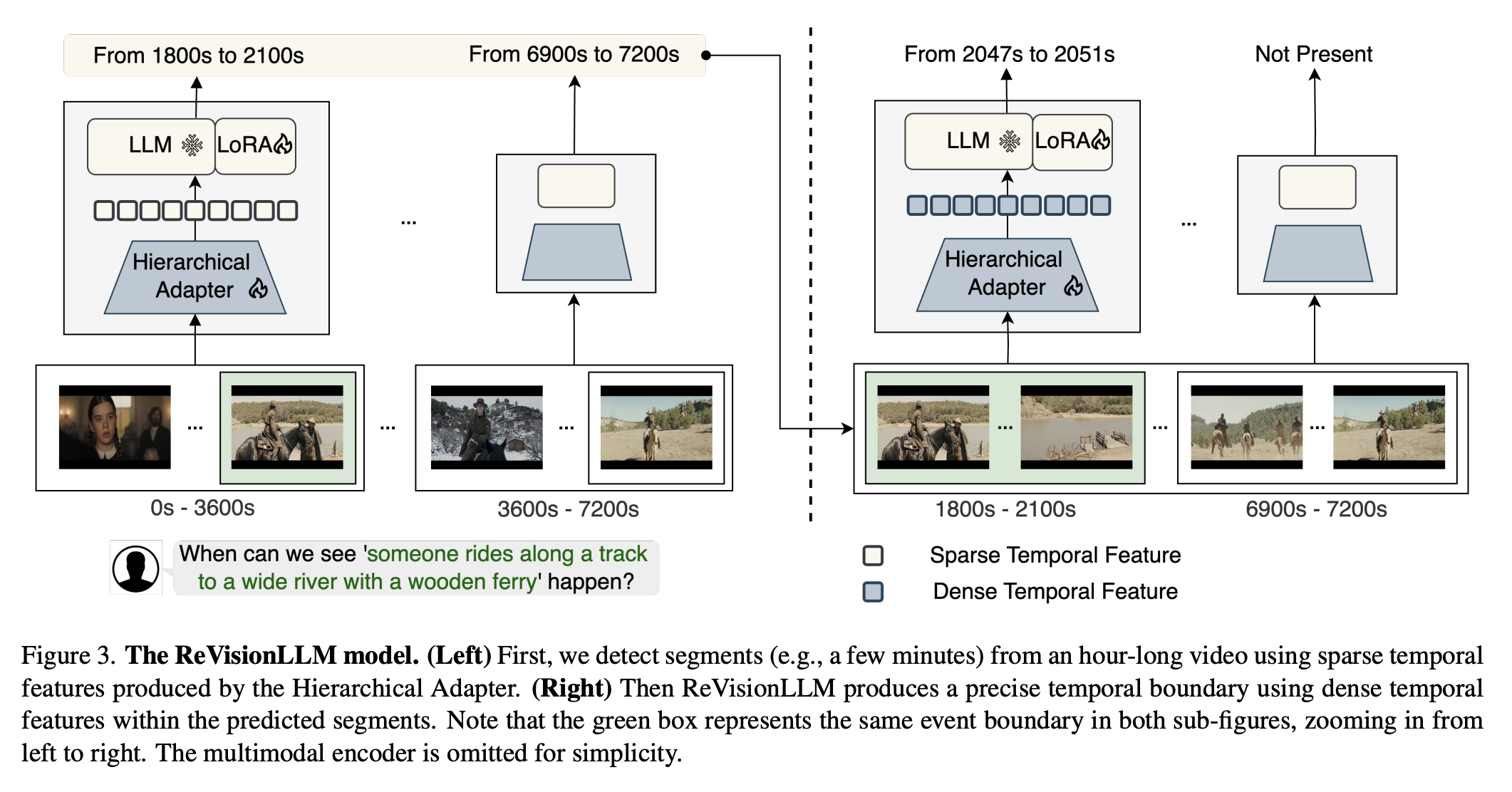 | Stage 1-A(Dense, 짧은 클립) | • 10–30 초 Positive·Negative 클립에 대해 “From s to e.” 또는 “Not Present.” 생성 | • boundary regression을 먼저 익혀 framing 감각 학습• Negative 클립으로 over-confidence 완화 | LoRA(LLM) + Hier-Adapter 모두 학습 |