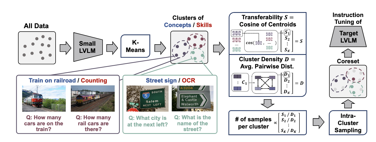 핵심 아이디어는 작은 vlm 을 사용해서, 어떤 데이터가 유용할지 골라낸다. 작은 모델의 내부 representation을 이용해서 training 데이터를 클러스터링을 한다. 그래서 데이터 속에서 concept - skill composition을 파악한다. (street sign/OCR) 이런식으로 어떤 컨셉인지, 그리고 이걸 답하기 위해서는 어떤 skill 이 필요한지 이런식으로 조합하는 느낌인거같다. 이렇게 하면 다양한 데이터를 소량만 뽑아도 성능 유지가 가능하다. 그래서 concept-skill composition으로 클러스터링을 해놓고, 각 클러스터에서 density와 transferability 를 기준으로 샘플링을 한다. 여기서 density는 얼마난 대표적인 데이터인지? Transferability 는 다른 concept-skill 클러스터쪽에도 도움이 되는 정보인지?
